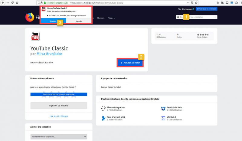4. Un petit pop-up s’affichera juste sous la barre d’adresse pour autoriser l’accès à vos données pour le site www.youtube.com, à ne pas confondre avec les données de votre compte YouTube. L’extension est également disponible sur GitHub. Cliquez sur « Ajouter ». Un nouveau pop-up s'affichera pour confirmer l'installation de l'extension.