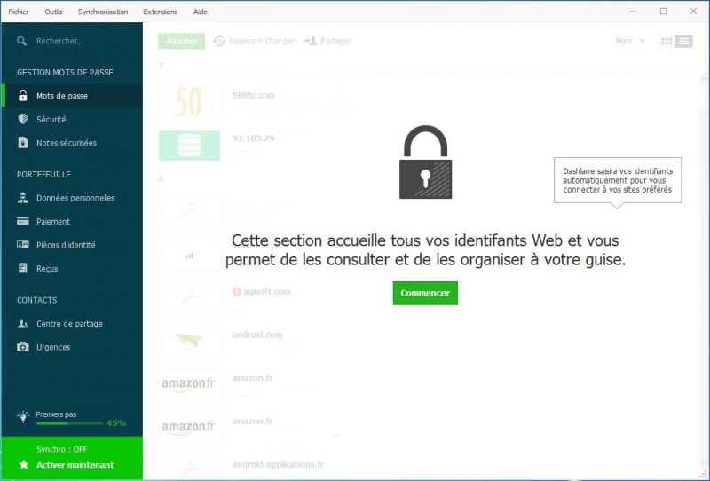 Ce qui est impressionnant avec Dashlane, c’est son intuitivité. A peine installé sur l’ordinateur, ce dernier propose dans son interface une foule de comptes, d'identifiants et de mots de passe. Ainsi même pas besoin d’ajouter manuellement vos mots de passe puisque Dashlane le fait automatiquement. Pratique ! Néanmoins si vous voulez en ajouter, vous pouvez. Pour cela, cliquez sur Fichier en haut à gauche, puis sur Importer un mot de passe.