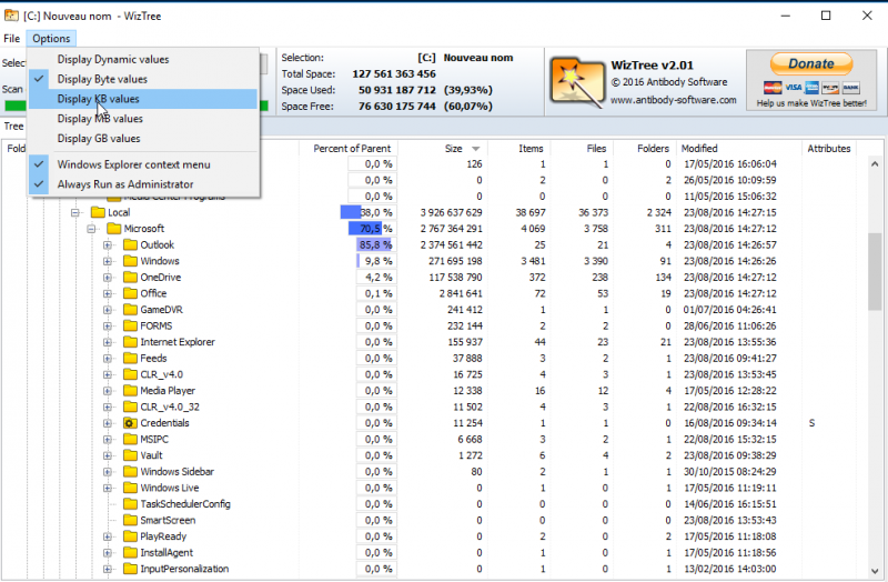 Afin d’optimiser la lisibilité des fichiers listés, le logiciel WizTree vous propose plusieurs options de classement. Pour cela, rendez-vous en haut de l’interface, cliquez sur Options, et choisissez celle que vous désirez.