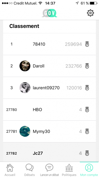 Sachez d'ailleurs que GOV établit un classement des utilisateurs les plus actifs. En consultant cette liste vous pourrez voir qui participe le plus au débat et note les politiques chaque jour, semaine ou mois.